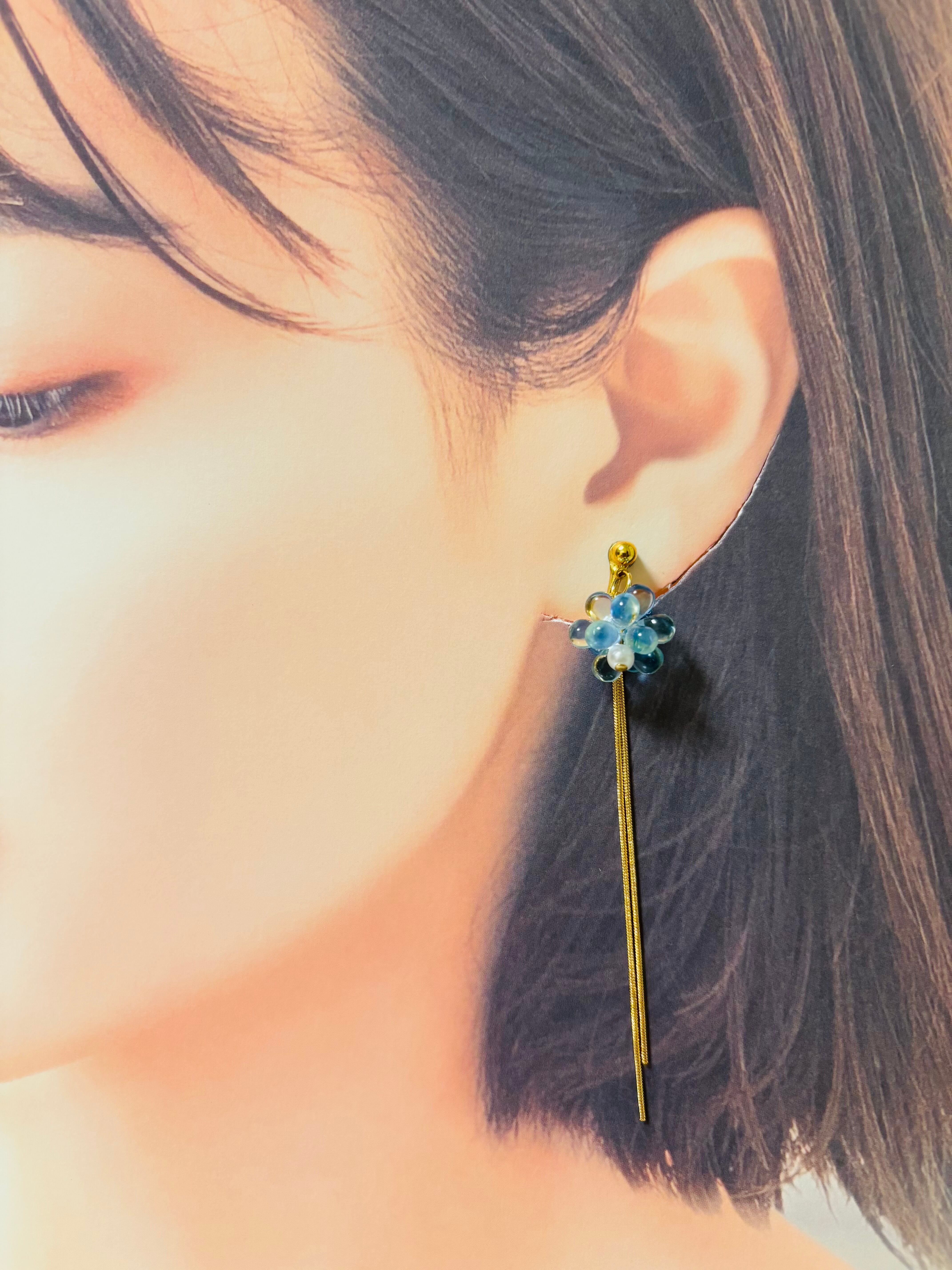 透きとおるブルーの花モチーフに、きらりと光るゴールドのロングチェーンを合わせました。