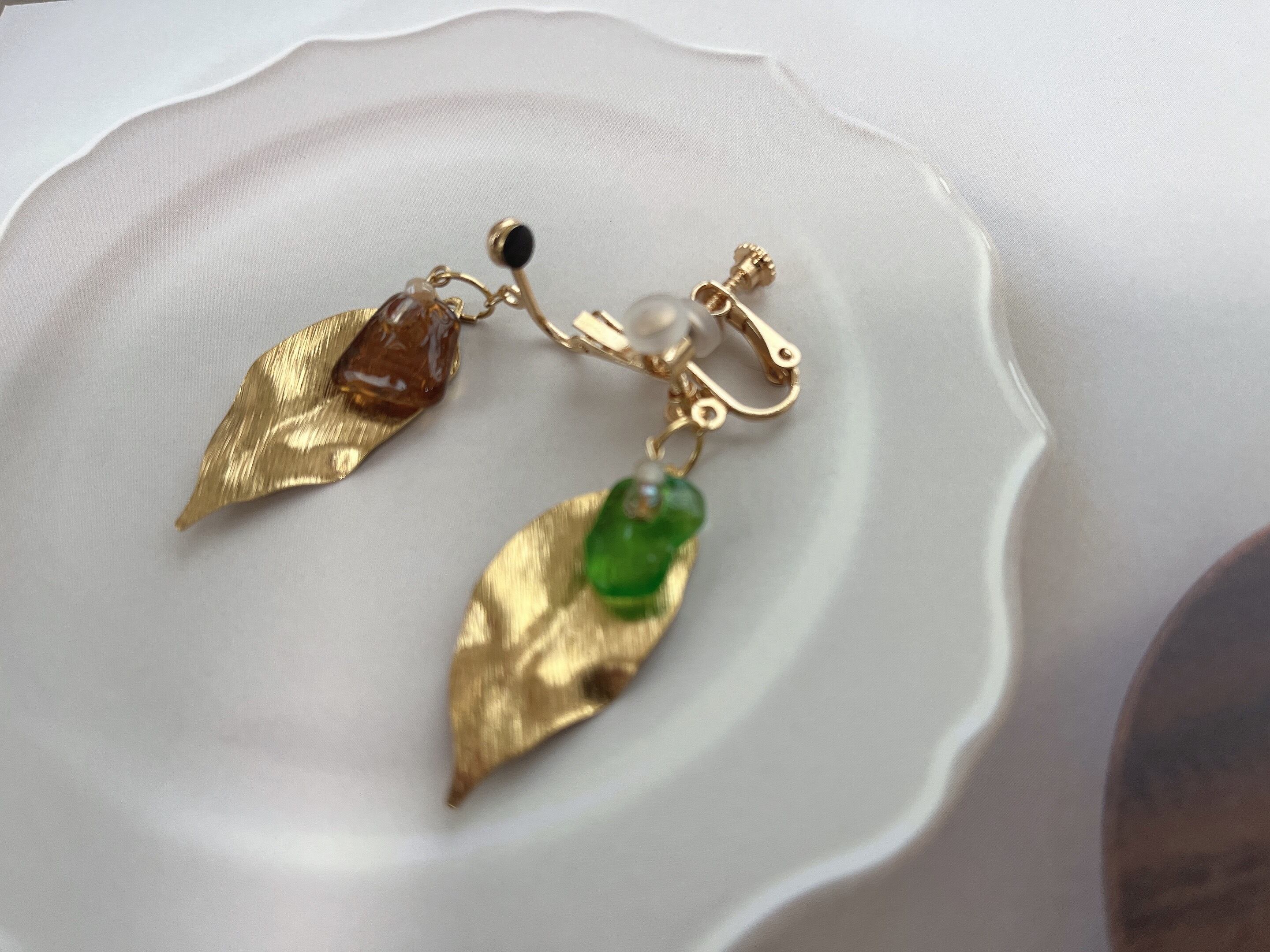 リーフときれいなシーグラスが耳元でゆらゆら。これからの季節ブラックのタートルと合わせてもとってもかわいいです。